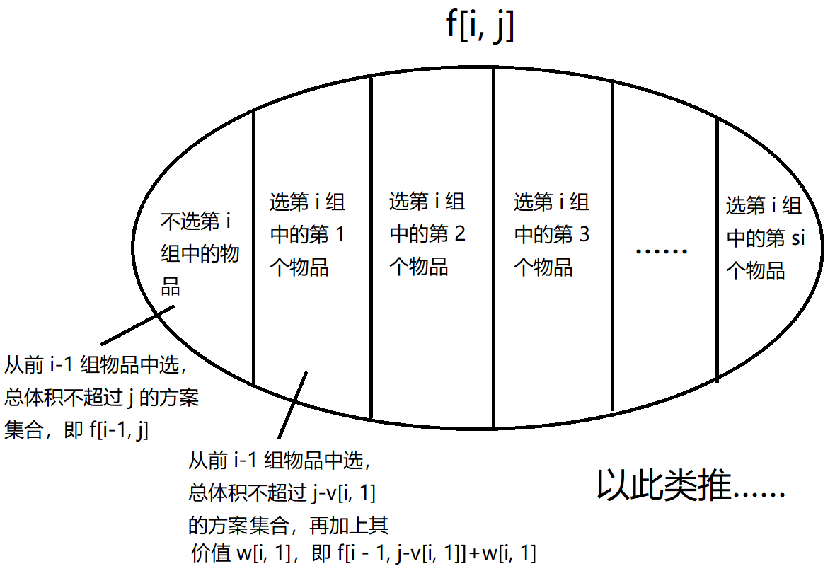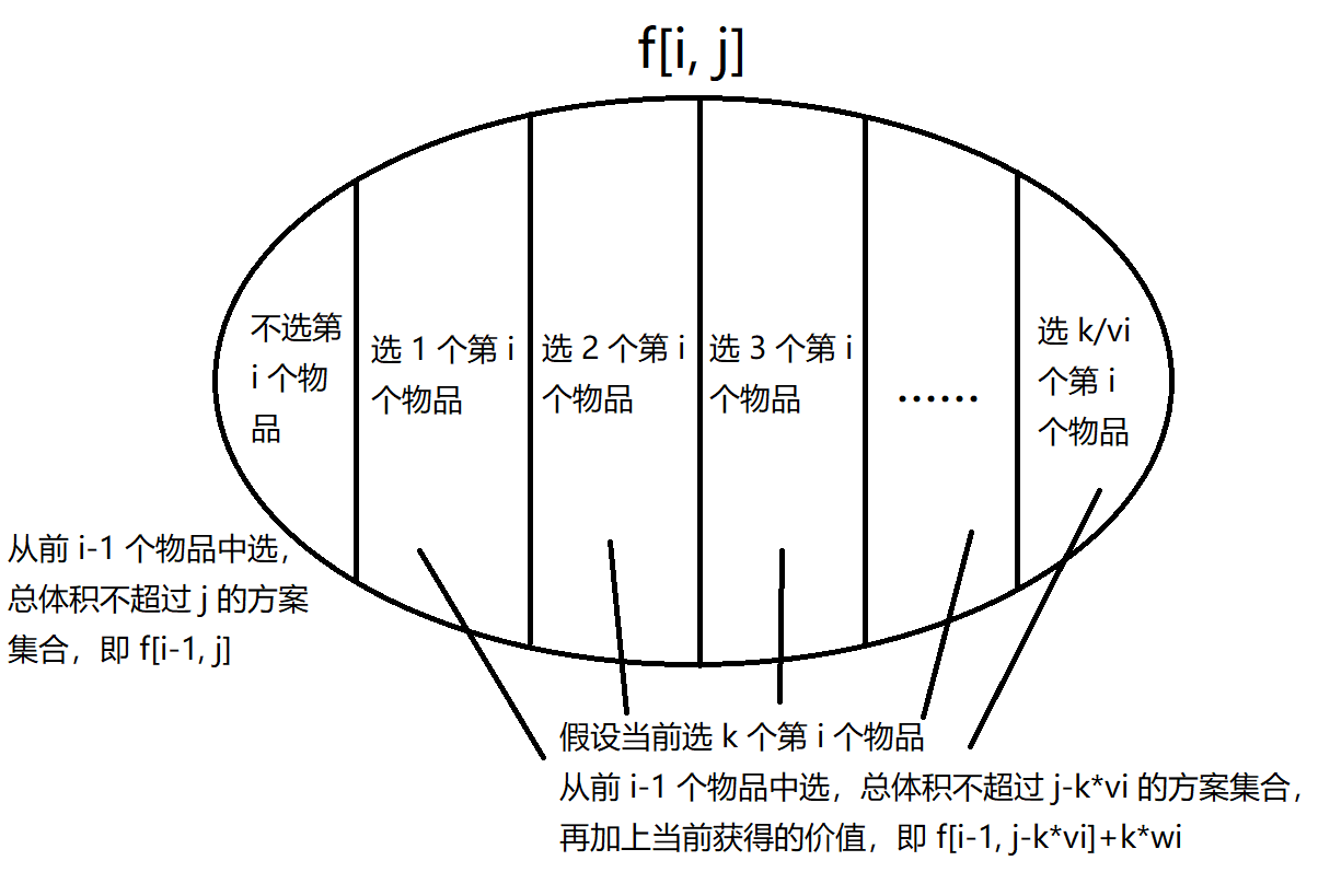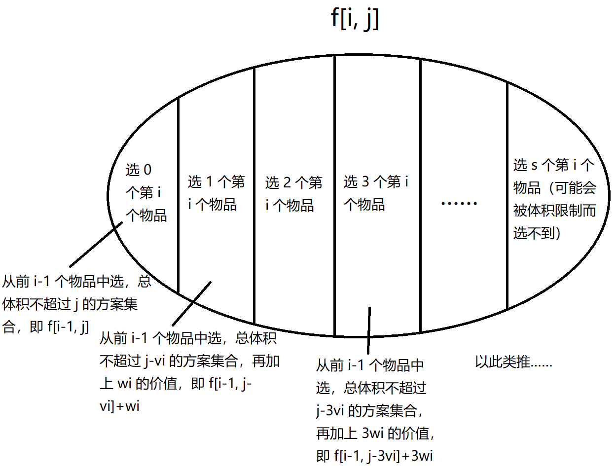 令 $f_{i,j}$ 表示 从前 $i$ 种物品中选,总体积不超过 $j$ 的方案集合。