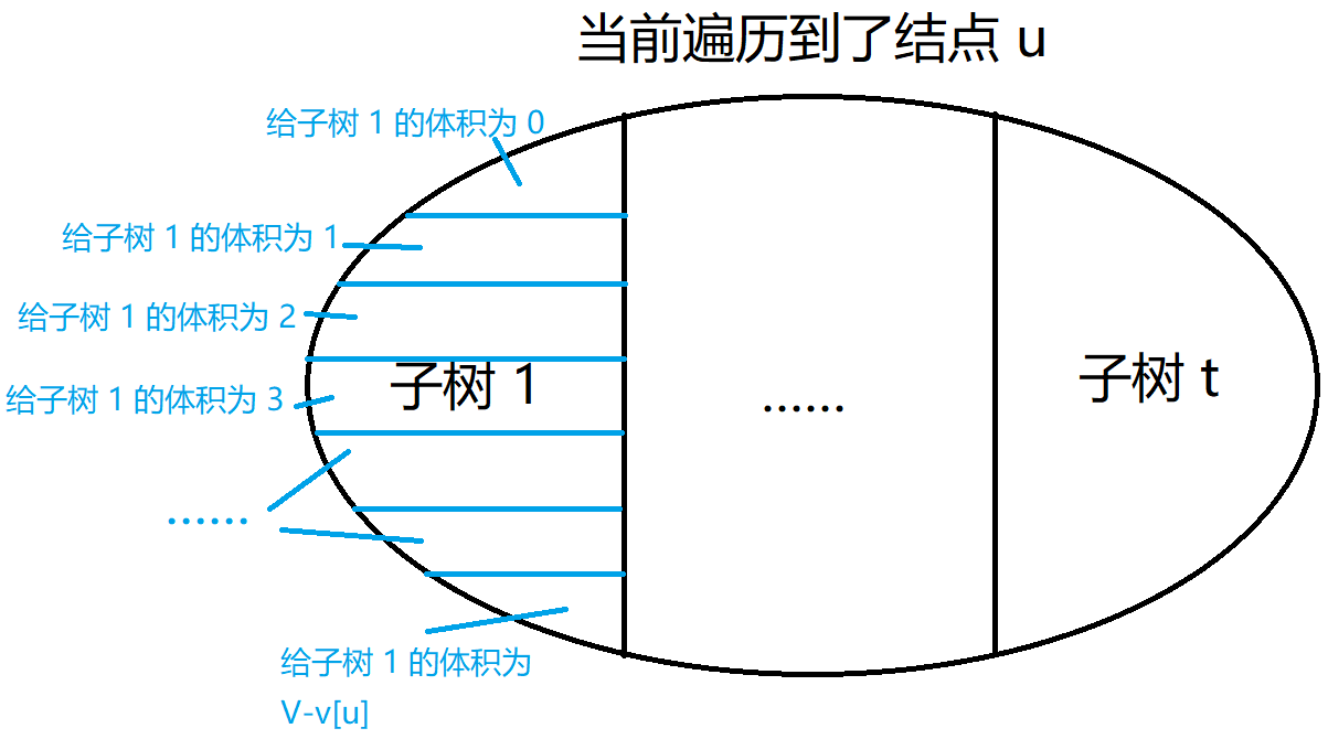 for (int j = V - v[u]; ~j; --j) // 由于一定要包含 u 结点,所以最大体积为 V-v[u]